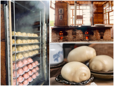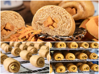 成份: 南瓜、地瓜、麩皮麵粉、無漂白中筋麵粉、砂糖、碘鹽/將南瓜塊熬煮至軟爛,放涼加入麵粉裡攪打至麵糰呈現亮麗的金黃色,將南瓜麵皮桿平,包入地瓜條放入蒸籠等待著二次發酵完成,再以大灶蒸至熟透!